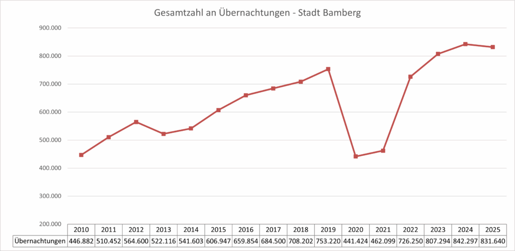Zusammen erzielten Bamberg und das Bamberger Land im vergangenen Jahr knapp unter 1,2 Millionen Übernachtungen, ein Rückgang von 32.500 Übernachtungen gegenüber 2024.