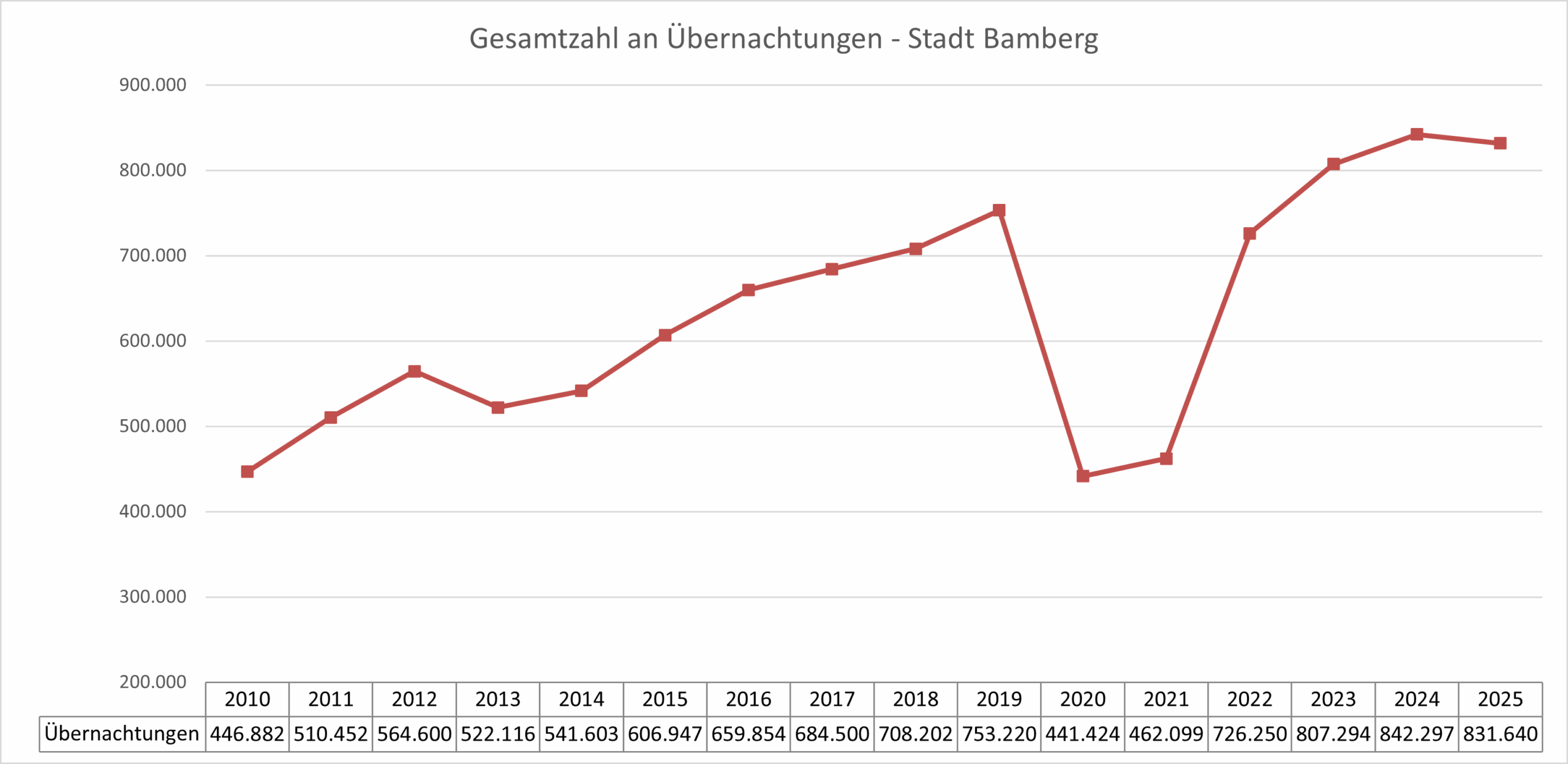 Die Übernachtungszahlen in der Stadt gingen um -1,3 % zurück auf 831.640, der Rückgang im Bamberger Land fiel mit -5,2 % auf 365.319 noch deutlicher aus.